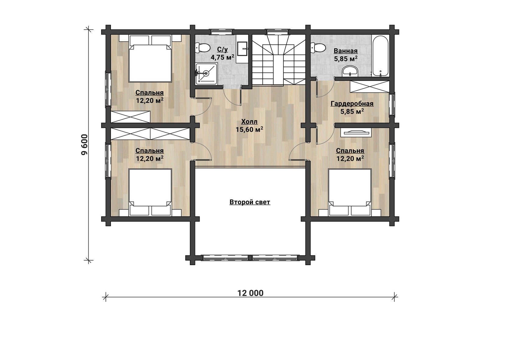 На втором уровне — три равные спальни по 12,2 м², чтобы у каждого было своё пространство;