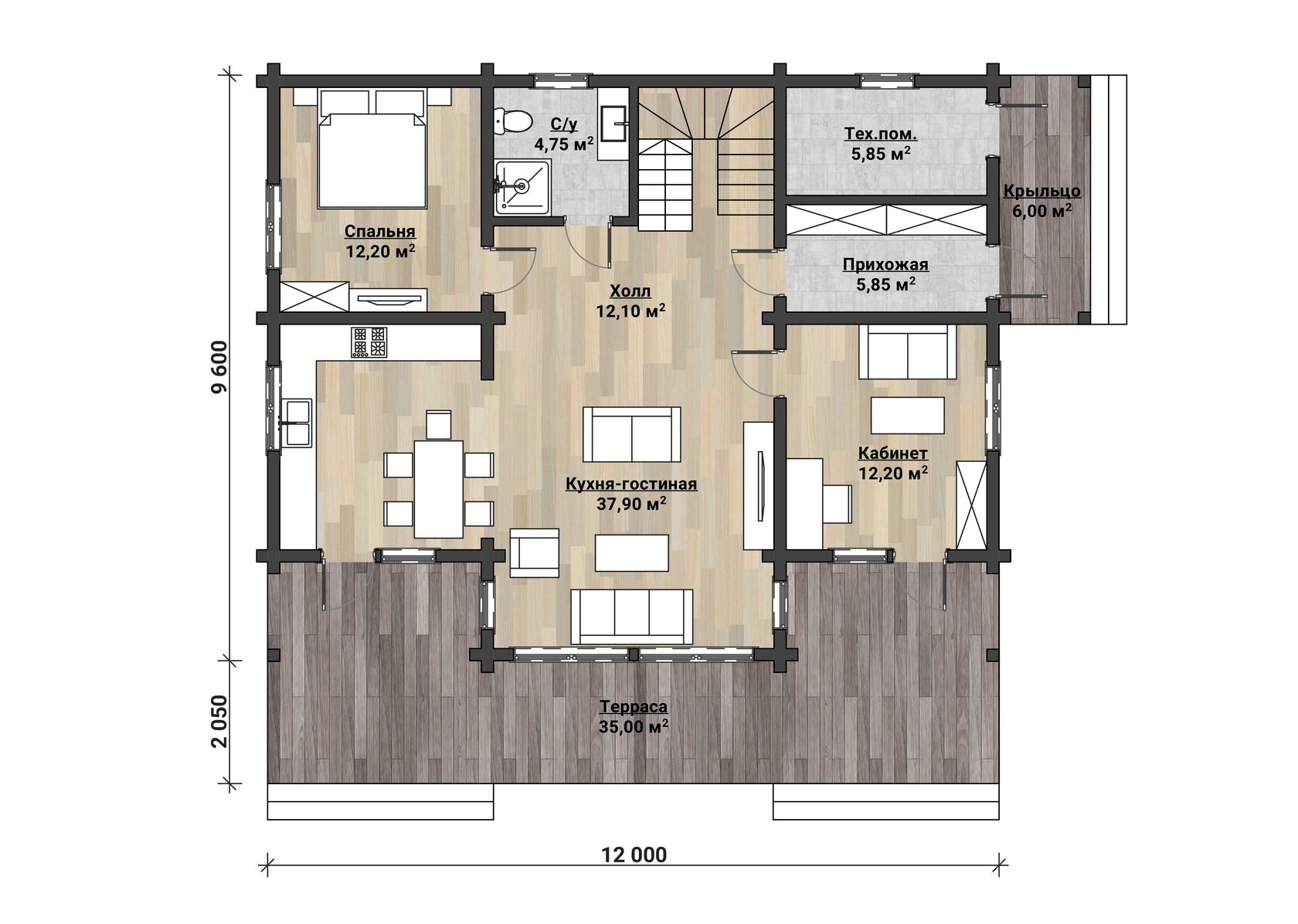 Первый этаж продуман для повседневной жизни: рядом с общей зоной — гостевая спальня 12,2 м² (для бабушек и друзей) и кабинет 12,2 м² — тихая комната для работы или будущая детская.