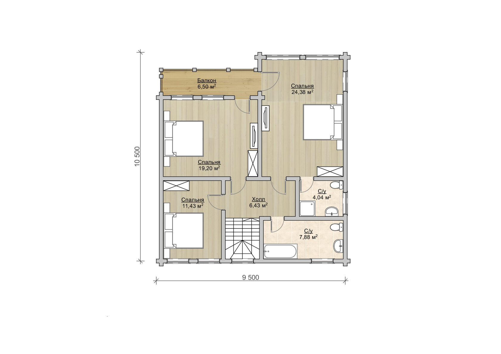 Второй этаж включает три спальни, два санузла и балкон с видом на участок — идеальное место для утреннего кофе или зимних вечеров с книгой.
