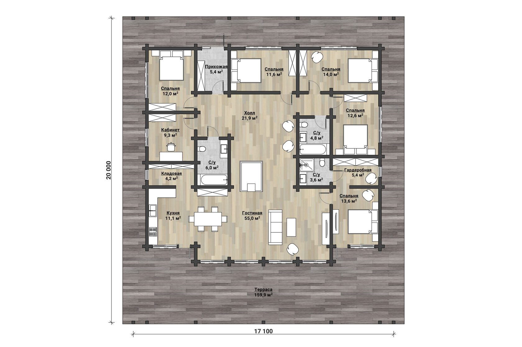 Спальни метраж: 5 (12,0 / 11,6 / 14,0 / 12,6 / 13,6 м²)