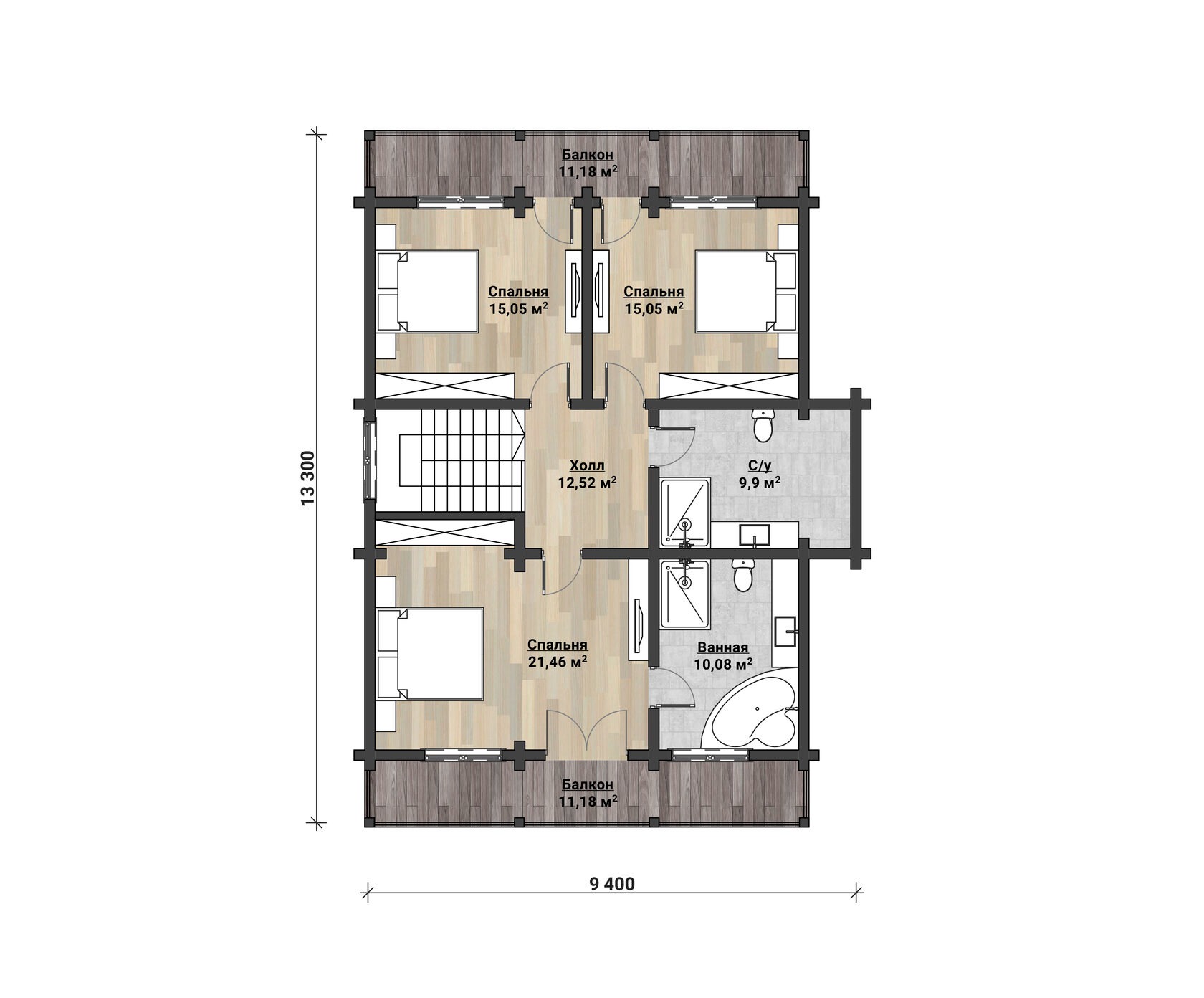 Верх — территория тишины: три спальни (21,46 / 15,05 / 15,05 м²), два санузла (9,90 и 10,08 м²) и холл 12,52 м² со вторым светом.