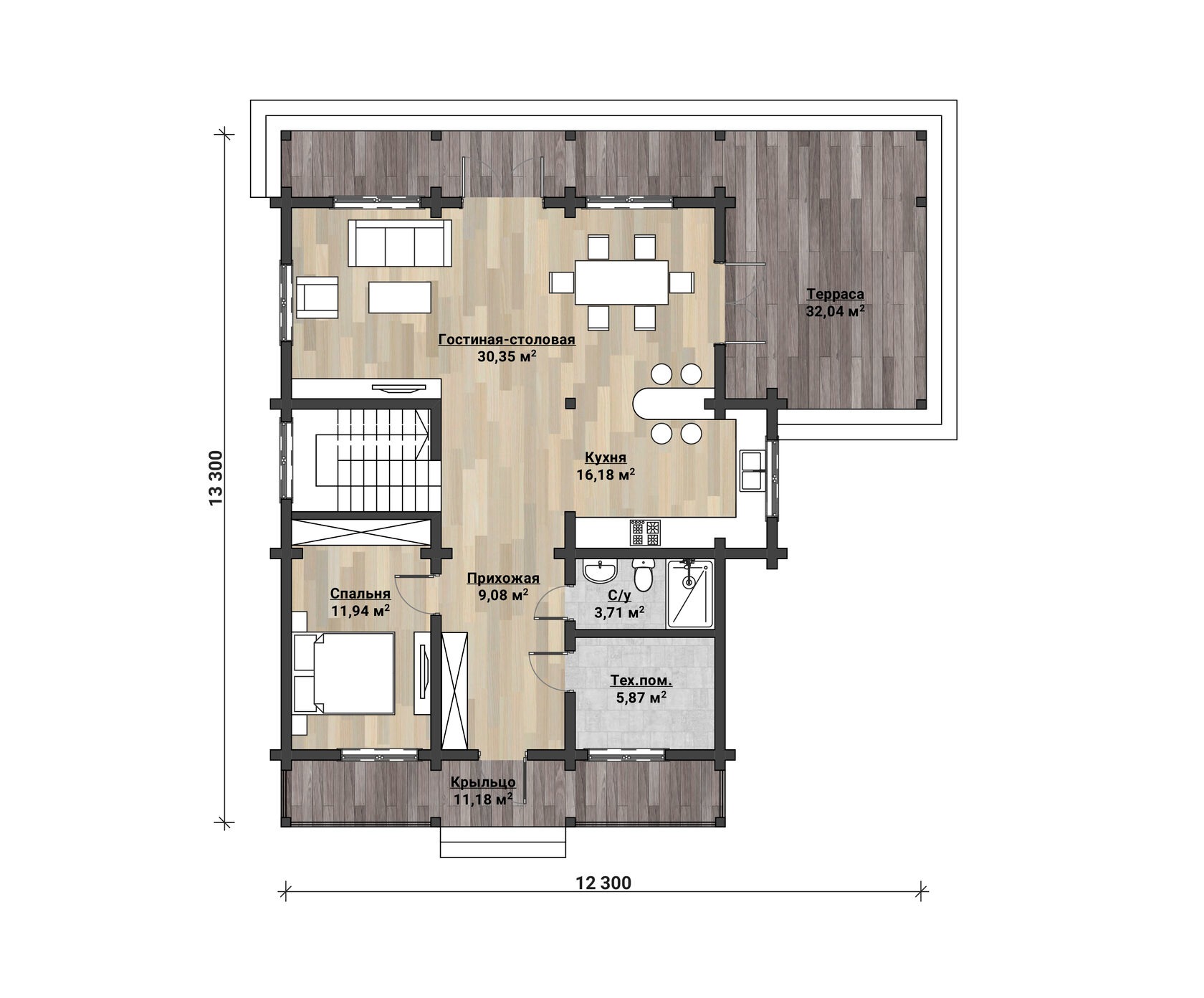 Сердце первого этажа — гостиная-столовая 30,35 м², объединённая с кухней 16,18 м²; вместе они образуют просторную общую зону 46,53 м² с прямым выходом на открытую террасу 32,04 м² под навесом.