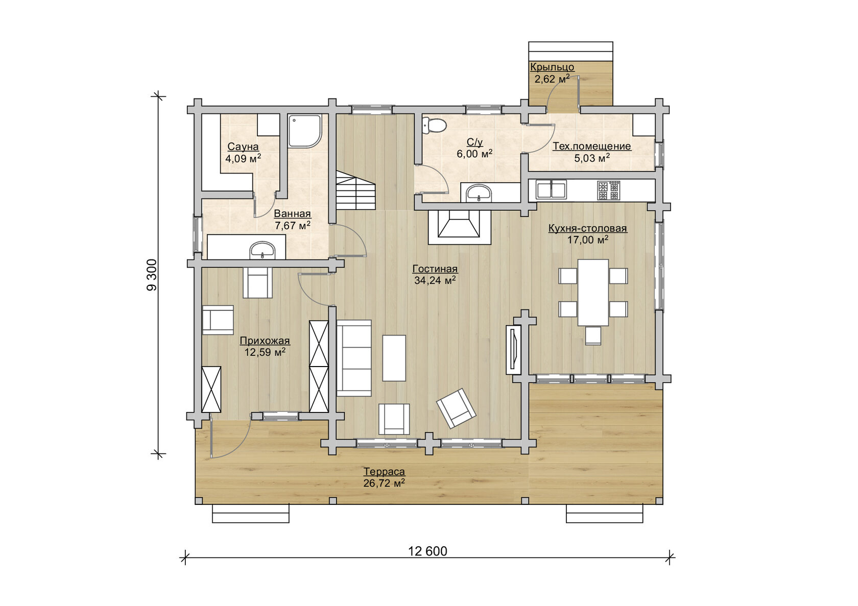 На первом этаже: просторная гостиная 34 м² с выходом на террасу, кухня-столовая 17 м², прихожая, ванная, сауна и техническое помещение.