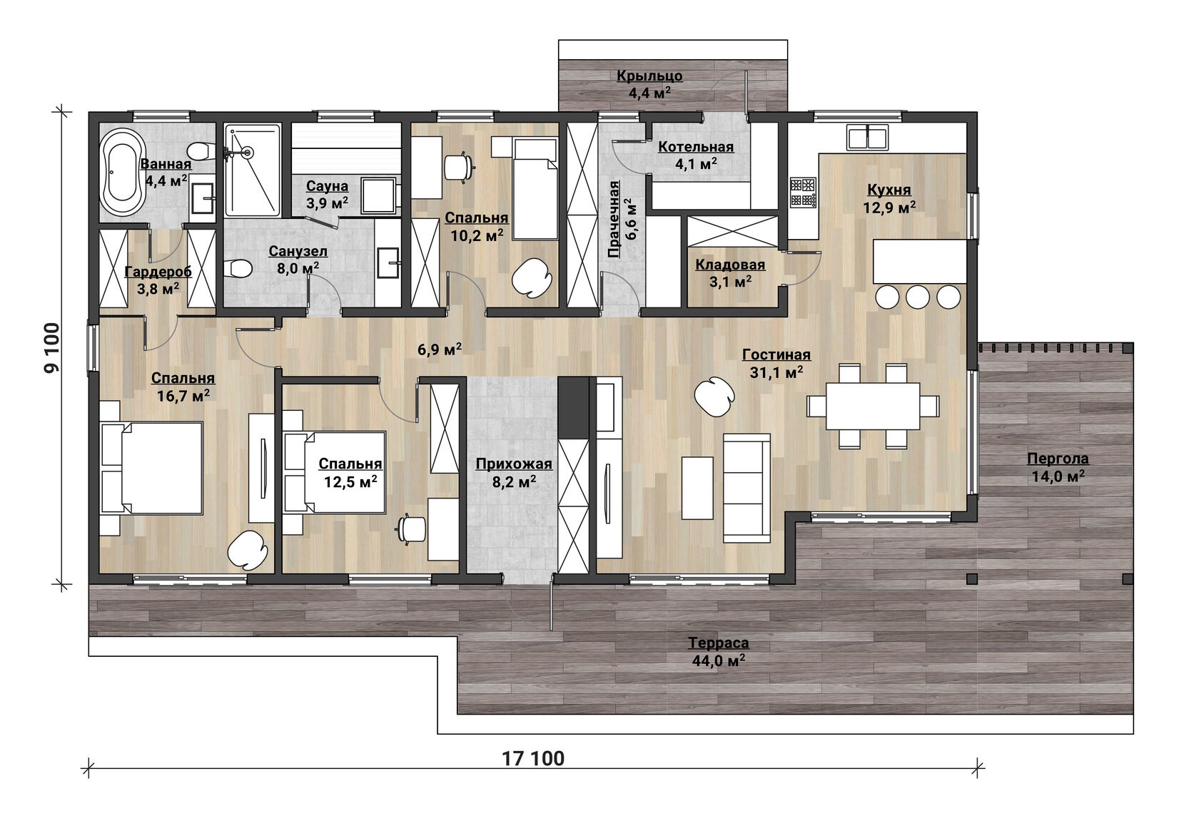 Здесь продуман каждый метр: входная группа с прихожей 8,2 м² и шкафами, из зоны дневной жизни — мягкий переход на деревянную террасу 44 м², где под перголой 14 м² удобно ставить летнюю столовую и плетёные кресла.